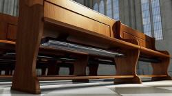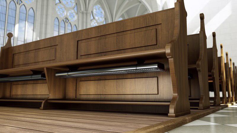 Das Heizelement ist in mattschwarzer Farbe lackiert und harmoniert sehr gut zu dem dunkeln Farbton des Holzes, aus dem die Bänke hergestellt sind. Auch Dank der Anbringung unter dem Sitz sind diese Infrarotheizungen für die Kirchenbesucher bei normalem Blick praktisch unsichtbar. Ein Standardbestandteil der Heizelemente ist auch das Schutzgitter, das die Besucher vor direktem Kontakt mit den Heizlamellen schützt. Die erste Applikation, in der diese Platten erfolgreich überprüft und installiert wurden, ist die St.-Gotthardt-Kirche in Bouzov.