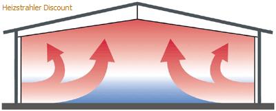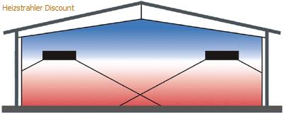 Die Effektivität der FRICO Hallenheizung / Strahlungsheizung liegt darin, dass die Wärmestrahlung die Luft nahezu ungehindert durchdringt. Sie wird erst beim Auftreffen auf feste Körper wirksam. Die Raumluft wird erst sekundär durch Konvektion an diesen Flächen temperiert. Durch die gezielte Wärmeübertragung lässt sich die Strahlung auch aus größeren Höhen in den Aufenthaltsbereich einbringen. So ist auch die Beheizung von Teilbereichen und einzelnen Arbeitsplätzen in Hallen möglich.